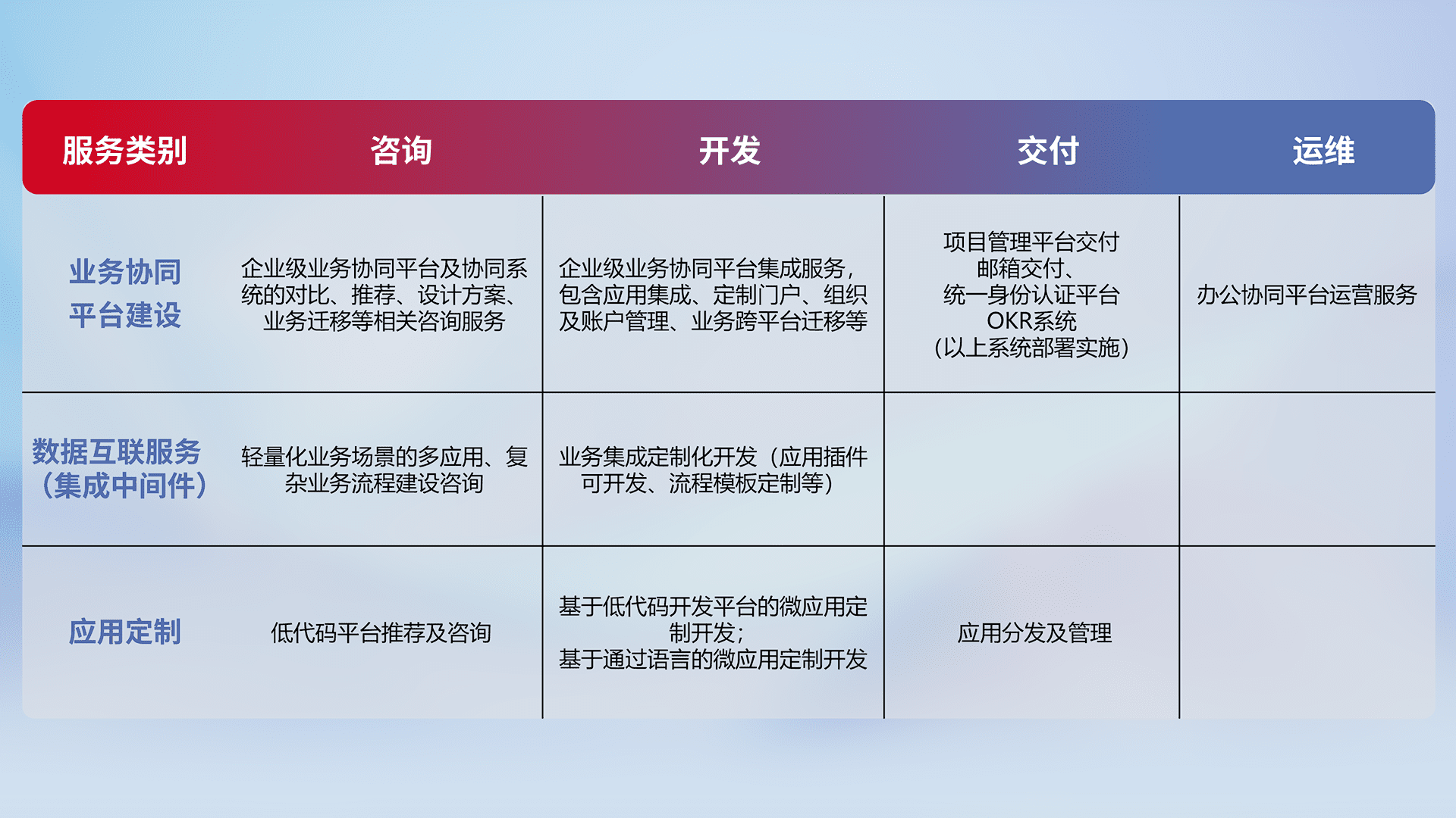针对钉钉、、、、企微、、IDaas等平台级产品提供产品的规划、、、方案、、、、交付、、、、定制化开发等服务,,,,实现如统一协同办公、、智能客户服务、、、、混合会议管理、、智能数据查询、、、、等业务场景,,,,实现数字化转型。。。。